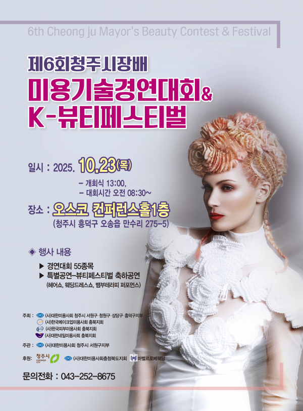 [충청중심뉴스] 청주시가 후원하고 대한미용사회 청주시서원구지부가 주관하는 제6회 청주시장배 미용기술경연대회&K-뷰티페스타가 10월 23일 오송 오스코에서 개최된다.