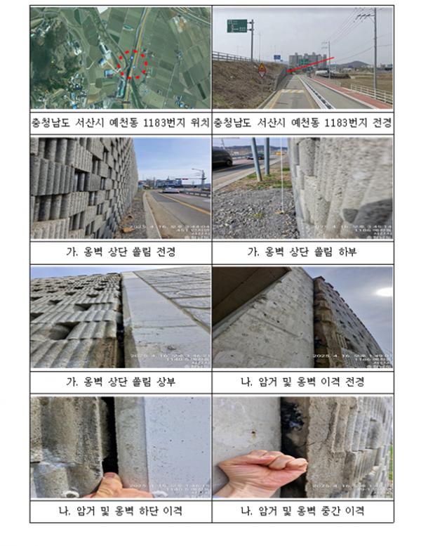 최 의원은 지방도 649호선 부실공사와 관련해 2025년 4월 직접 둔당교 현장을 방문해 통로 박스와 옹벽 연결부 틈새 발생, 옹벽 부풀어 오름, 도로방향 기울어짐 등 심각한 위험 요소를 확인하고 이를 국회와 정부, 충남도에 공문으로 근본적인 보수공사를 요청했다.