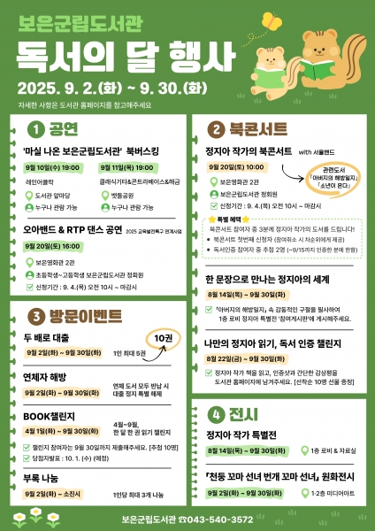 이옥순 주민행복과장은 “책과 공연, 체험이 함께하는 이번 행사가 군민 모두에게 특별한 가을의 기억이 되길 바란다”며 “독서의 달을 통해 도서관이 군민과 함께하는 문화 공간으로 자리매김하길 기대한다”고 말했다.