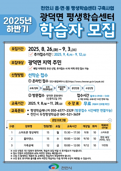 프로그램 접수는 천안시 통합예약시스템 및 해당 지역의 평생학습센터에서 가능하다.