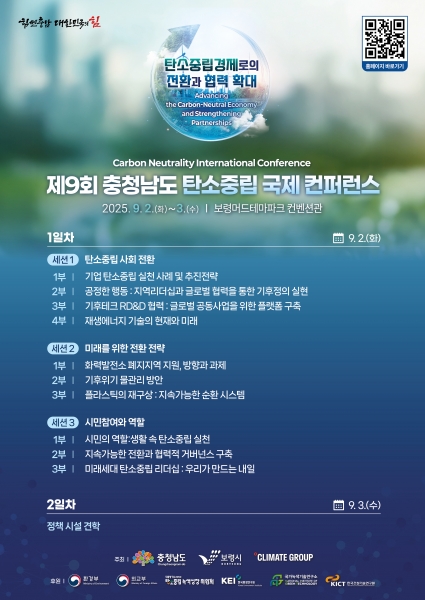 [충청중심뉴스] 충남도는 9월 2-3일 보령 머드테마파크 컨벤션관에서 ‘제9회 충청남도 탄소중립 국제 콘퍼런스’를 개최한다고 26일 밝혔다.
