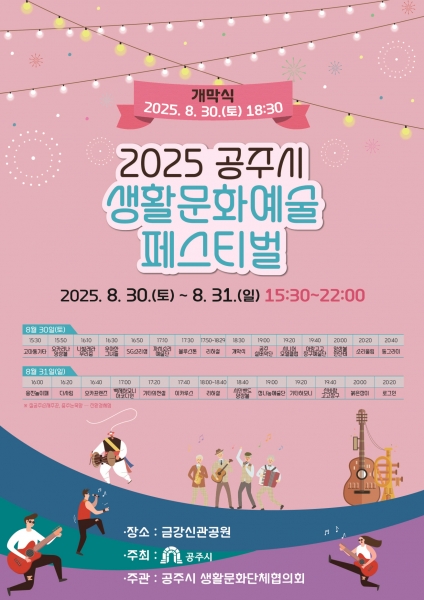 [충청중심뉴스] 공주시는 공주시 생활문화단체협의회와 함께 ‘2025 공주시 생활문화예술 축제’를 오는 8월 30일과 31일 이틀간 금강신관공원에서 연다고 밝혔다.