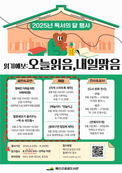 [충청중심뉴스] 예산군 공공도서관은 독서의 달을 맞아 예산 군민을 대상으로 오는 9월 2일부터 9월 30일까지 독서의 달 행사를 운영한다.