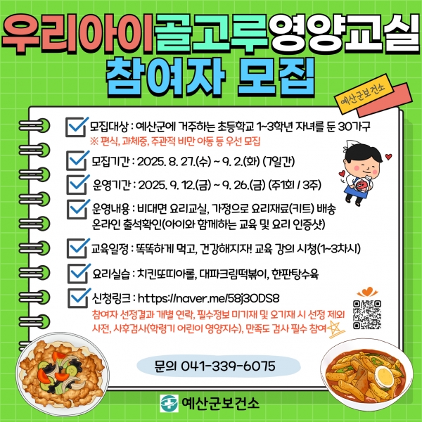 이번 프로그램은 편식을 줄이고 균형 잡힌 식단을 구성하는 방법을 배우는 교육과 함께 △치킨 또띠아롤 △대파 크림떡볶이 등 아이들이 즐겁게 만들고 먹을 수 있는 요리 실습으로 구성된다.