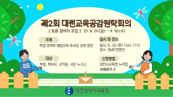[충청중심뉴스] 대전시교육청은 9월 30일 오후 2시 BMK컨벤션에서 ‘학생 마약류 예방교육 효과성 강화 방안’ 이라는 주제로‘2025년 제2회 대전교육공감원탁회의’를 개최할 예정이며 토론회에 참여할 토론자를 모집한다고 밝혔다.