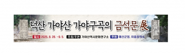 [충청중심뉴스] 예산군은 오는 8월 28일부터 9월 5일까지 이음창작소에서 ‘덕산 가야산 가야구곡 금석문 전시회’를 개최한다고 밝혔다.
