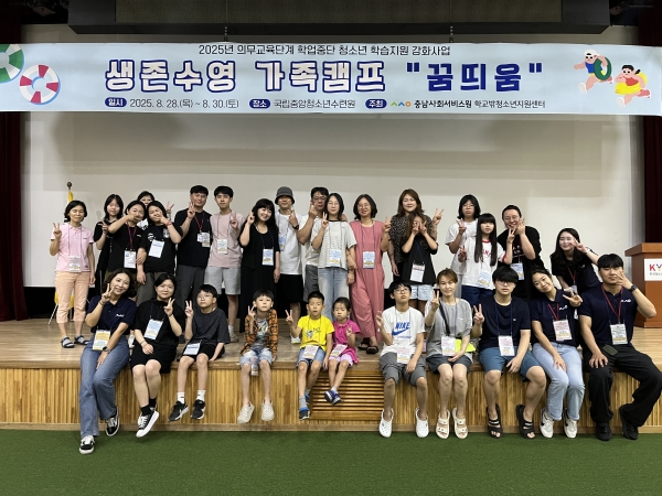 [충청중심뉴스] 충남사회서비스원 학교밖청소년지원센터에서 오는 8월 28일부터 8월 30일까지, 국립중앙청소년수련원에서 저연령 학교 밖 청소년 및 꿈이음 청소년을 대상으로 한 생존수영 가족캠프 ‘꿈띄움’을 운영한다고 밝혔다.