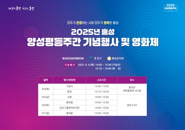 [충청중심뉴스] 홍성군은 ‘2025 홍성군 양성평등주간’을 맞아 군민과 함께하는 다양한 프로그램을 마련하며 성평등 문화 확산에 나섰다.