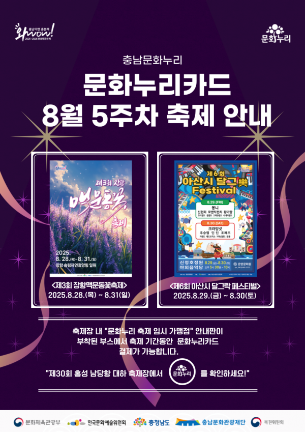 [충청중심뉴스] 충남문화관광재단은 도내 여름 대표 축제인 ‘제3회 장항 맥문동꽃 축제’ 및 ‘제6회 아산시 달그락 페스티벌’에서 문화누리카드 사용이 가능하다고 27일 밝혔다.
