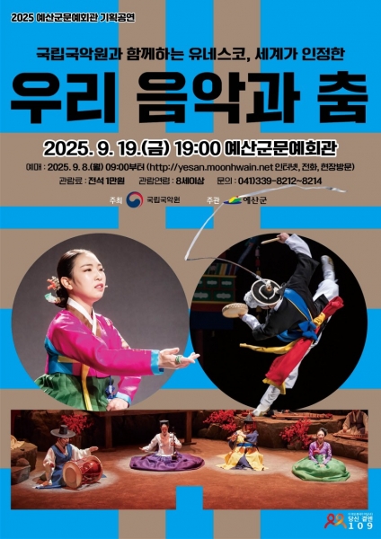 [충청중심뉴스] 예산군문예회관은 오는 9월 19일 오후 7시, ‘유네스코, 세계가 인정한 우리 음악과 춤’을 선보인다.