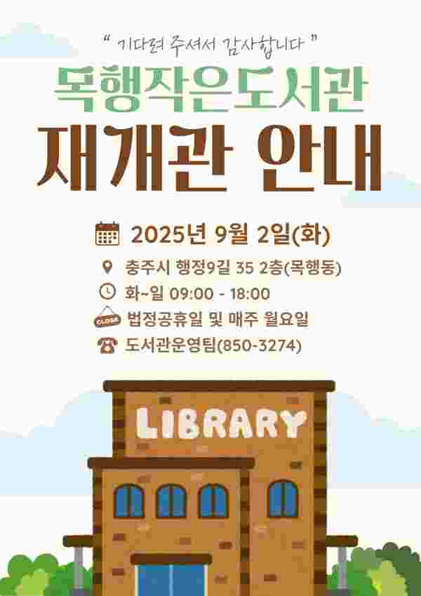 [충청중심뉴스] 충주시는 목행작은도서관이 8개월간의 리모델링 공사를 마치고 오는 9월 2일 새롭게 개관한다고 밝혔다.