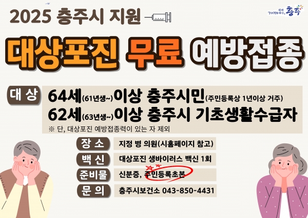한편 충주시는 예방접종 대상을 일반 시민은 매년 2세씩, 기초생활수급자는 매년 1세씩 지속적으로 확대 지원해, 오는 2027년까지 60세 이상 모든 시민이 무료 예방접종을 받을 수 있도록 지원할 계획이다.