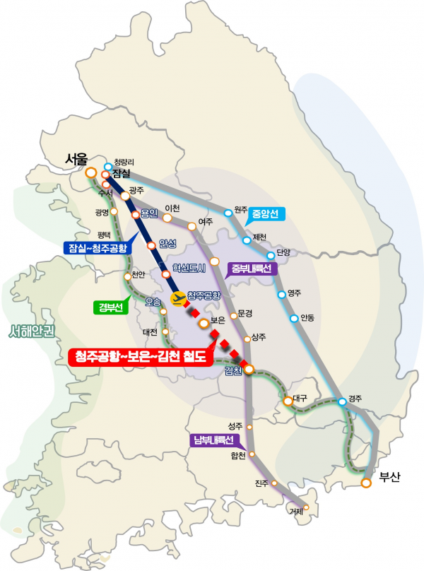 ‘청주공항~보은~김천’ 철도 노선은 대한민국 중부와 남부를 연결하는 직결 노선으로 약 3조 원의 사업비를 투입해 96.1km의 단선 철도를 신설하는 사업이다.