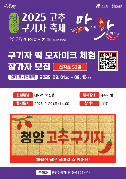 강희선 관광진흥과장은 “올해 축제를 개편하면서 가족 단위 관광객들이 즐겁게 참여할 수 있는 체험 프로그램을 마련했다”며 “청양의 특산물인 고추와 구기자를 활용한 체험을 통해 잊지 못할 추억과 담아가는 기쁨을 동시에 느끼시길 바란다”고 전했다.