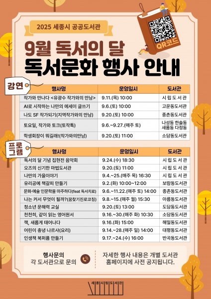 [충청중심뉴스] 세종시 시립도서관이 9월 독서의 달을 맞아 관내 공공도서관15곳에서 시민 독서 문화 확산을 위한 각양각색의 독서문화 행사를 운영한다.