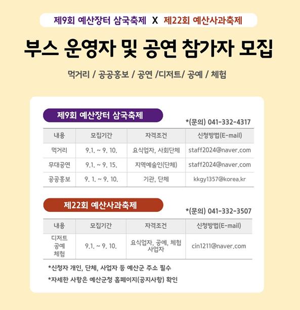 무대공연은 장르 구분 없이 20분 내외의 공연이 가능한 최근 1년 이상 활동 실적이 있는 관내 예술인 및 단체를 15개팀 내외로 모집하며 사과축제 판매부스는 예산사과를 주제로 한 디저트·공예품·체험 프로그램을 운영할 관내 요식업자와 공예·체험 사업자 10개팀을 모집한다.