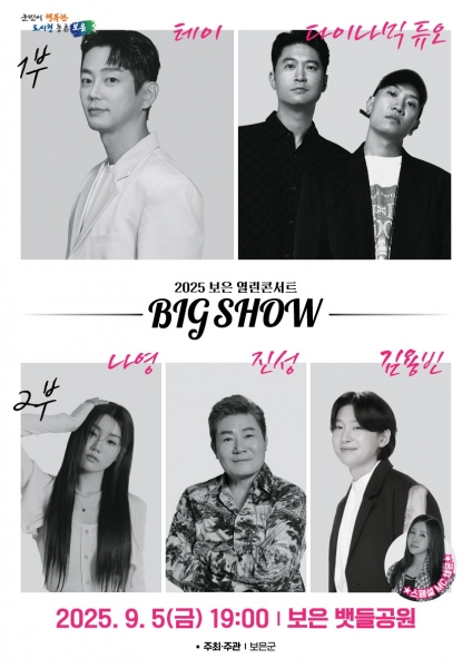 [충청중심뉴스] 보은군은 군민들에게 고품격 문화예술을 선사하기 위해 오는 9월 5일 저녁 7시, 보은읍 뱃들공원 야외공연장에서 ‘2025 보은 빅쇼 열린콘서트’를 개최한다.