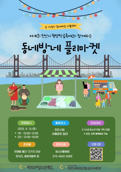 [충청중심뉴스] 천안시청소년재단 천안시태조산청소년수련관은 ‘동네방네 플리마켓’ 참가자를 선착순 모집한다고 2일 밝혔다.