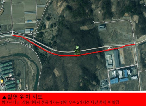 7일 오후 6시부터 8일 오전 5시까지는 오송읍 상봉리에서 정중리 방향 병마산터널 한 개 차로가 일부 통제되며 남은 1개 터널에서 양방향 교행하게 된다.
