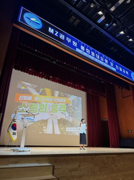 이번 교육은 9월 직원 월례모임 특강과 연계해 진행됐으며 서울특별시 홍보기획관 민원기획팀 임유미 강사를 초빙해 ‘민원전화 두려운 MZ공무원 통화 응대 요령’을 주제로 강연을 진행했다.
