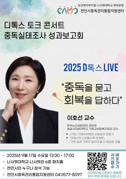 [충청중심뉴스] 천안시중독관리통합지원센터는 오는 9월 17일 ‘도박중독 추방의 날’을 맞아 나사렛대학교에서 ‘디톡스 라이브 토크콘서트’를 개최한다고 3일 밝혔다.