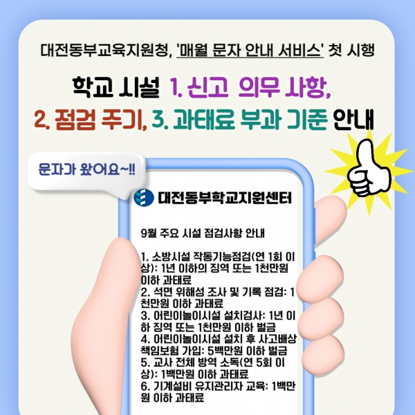 [충청중심뉴스] 대전동부교육지원청은 9월 4일부터 관내 교직원 270여명을 대상으로 학교 시설 주요 점검사항을 매월 사전에 발송하는 ‘문자 안내 서비스’를 처음으로 시행한다고 밝혔다.