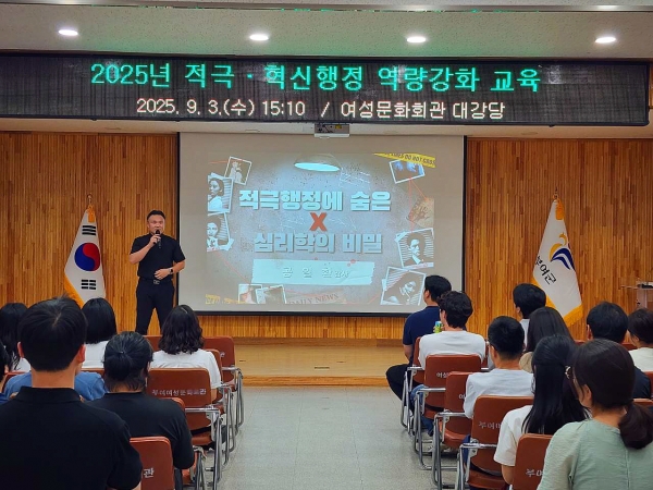 특히 적극 행정과 심리학을 연계해 공직자가 업무 중 마주할 수 있는 적극 및 혁신 행정의 장애요인과 이를 극복할 수 있는 심리적 기법을 다루며 직원들의 공감과 호응을 이끌었다.