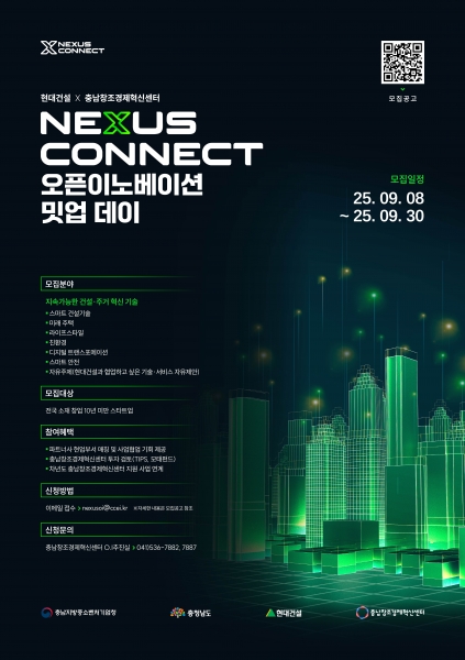 [충청중심뉴스] 충남창조경제혁신센터는 글로벌 건설·주거 인프라 혁신을 선도하는 현대건설과 함께 ‘2025 Nexus Connect 오픈이노베이션 밋업 데이’를 개최하고 지속가능한 미래 건설과 주거 환경 혁신을 이끌 스타트업을 오는 9월 8일부터 9월 30일까지 모집한다고 밝혔다.