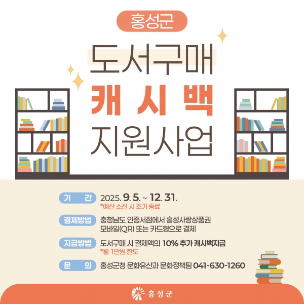 [충청중심뉴스] 홍성군은 도서구매를 통해 지역 주민의 독서문화를 확산시키고 지역 경제 활성화를 목표로 '홍성군 충남 인증서점 도서구매 캐시백 지원사업'을 5일부터 본격 추진한다고 밝혔다.