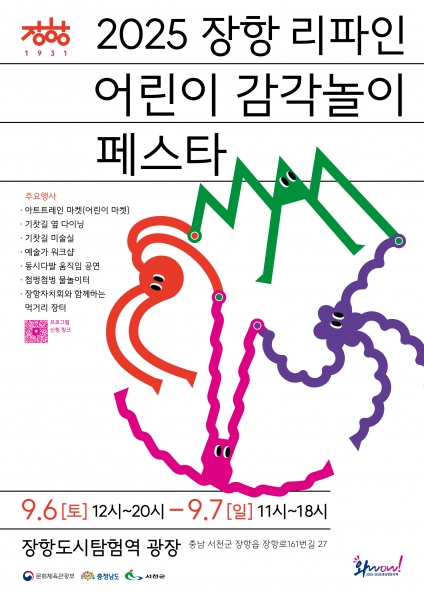 군은 오는 9월 6일부터 7일까지 이틀간 장항 도시탐험역 광장 일원에서 ‘장항 리파인 문화재생사업 준공식’과 ‘장항 어린이 감각놀이 페스타’를 개최한다고 밝혔다.