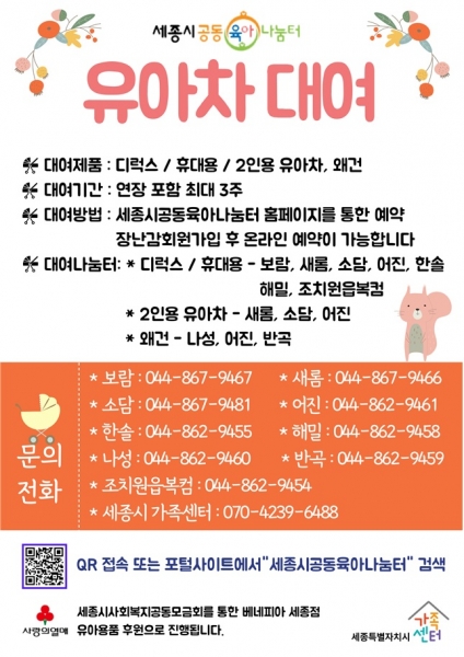대여 서비스 이용방법 등 자세한 사항은 세종시가족센터나 대여나눔터로 문의하면 된다.
