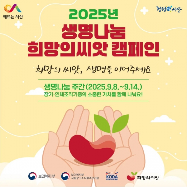 [충청중심뉴스] 충남 서산시가 9월 9일 장기기증의 날 기념 생명나눔 주간을 맞아 8일부터 14일까지 생명나눔 희망의 씨앗 캠페인을 운영한다.
