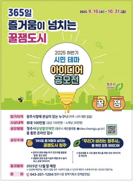시 관계자는 “이미 각 분야에서 시민들의 아이디어가 청주시민의 일상에 활력을 더하고 있다”며 “이번 공모전을 통해 더 많은 시민이 참여해 더욱 즐거운 청주시로 함께 성장할 수 있기를 기대한다”고 말했다.