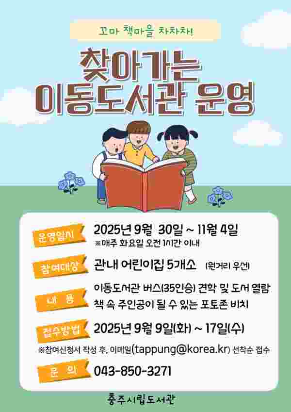 [충청중심뉴스] 충주시립도서관은 9월 말부터 11월 초까지 매주 화요일마다 어린이집으로 직접 찾아가는 ‘이동도서관’을 운영한다고 밝혔다.
