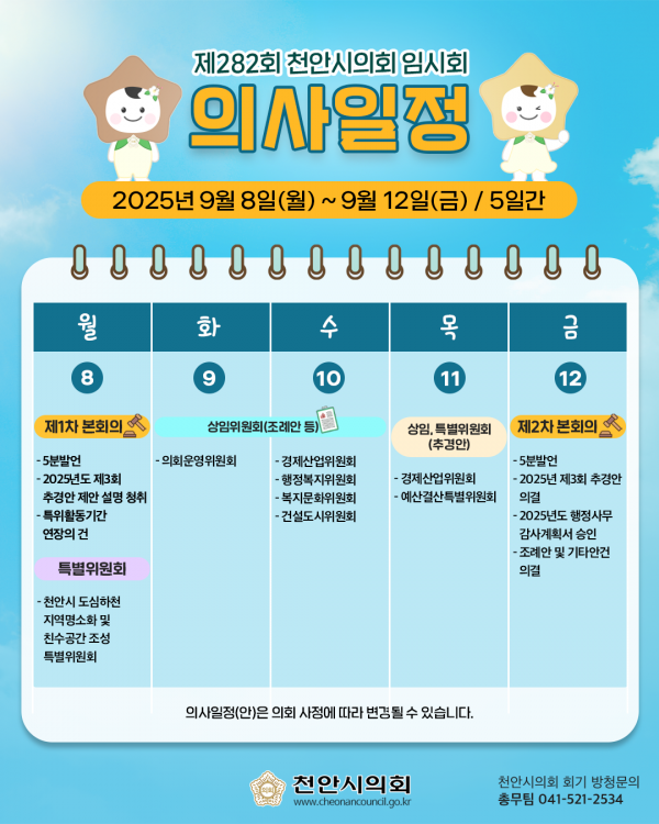 [충청중심뉴스] 천안시의회가 9월 8일부터 12일까지 제282회 임시회를 운영한다.