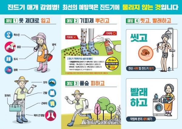 진드기에게 물리지 않으려면 △풀밭에 앉거나 눕지 않기 △긴 옷과 장화 착용 △기피제 사용 △귀가 후 샤워 및 진드기 확인 등 기본 예방수칙을 꼭 지켜야 한다.