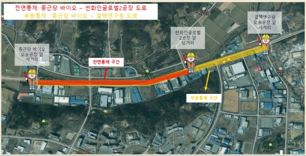 종근당 바이오 오송공장 앞 사거리에서 썬화인글로벌2공장 앞 삼거리까지는 전면 통제가, 썬화인글로벌2공장 앞 삼거리에서 결핵연구원 오송공장 앞 사거리까지는 부분 통제가 진행된다.