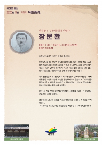 [충청중심뉴스] 예산군은 고덕면 상궁리 출신 장문환 독립운동가를 ‘2025년 9월 이달의 독립운동가’로 선정했다고 밝혔다.
