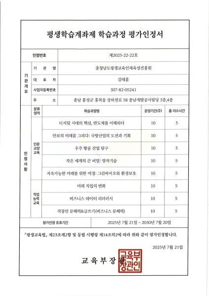 [충청중심뉴스] 충남평생교육인재육성진흥원은 교육부와 국가평생교육진흥원이 주관한 제22차 평생학습계좌제 학습과정 평가인정 심사를 통과해 평가인정서를 수여받았다.
