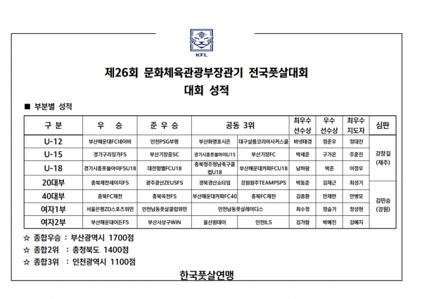 20대부에서는 충북제천세이지FS가 우승, 40대부에서는 충북FC제천이 우승을 차지하며 뛰어난 기량을 입증했다.