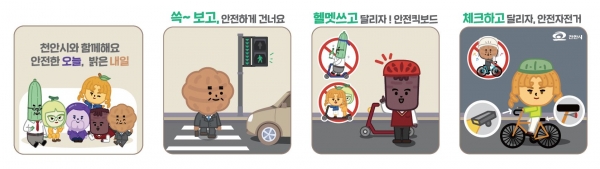 천안프렌즈 캐릭터 그래픽디자인은 횡단보도·개인형 이동장치·자전거 이용 안전수칙을 담아냈다.