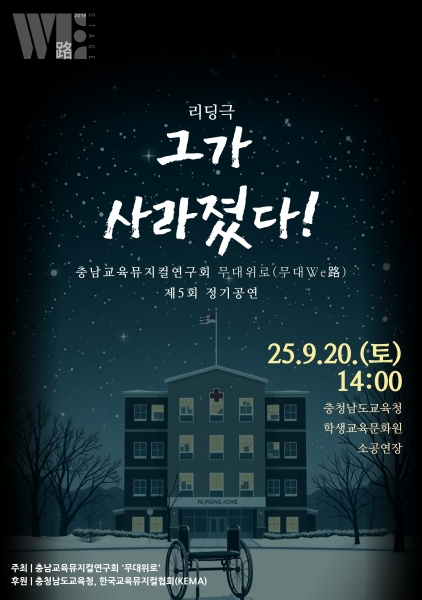 [충청중심뉴스] 충남교육청은 오는 9월 20일 오후 2시, 충청남도교육청학생교육문화원 소공연장에서 충남교육뮤지컬연구회 ‘무대WE路’의 제5회 정기 공연 ‘리딩극 그가 사라졌다’를 개최한다.