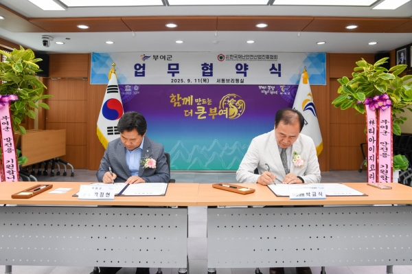 [충청중심뉴스] 부여군과 한국재난안전산업진흥협회는 지난 9월 11일 부여군청에서 상호협력과 신뢰를 바탕으로 군민의 삶의 질 향상과 각종 재난안전사고 예방을 위한 업무협약을 체결했다.