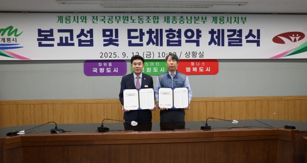 [충청중심뉴스] 계룡시는 지난 12일 전국공무원노동조합 세종충남본부 계룡시지부와 함께 직원들의 근무환경 개선을 위한 단체협약을 체결했다.