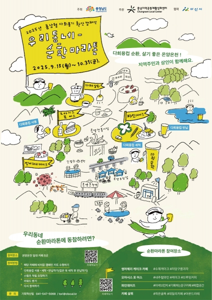 [충청중심뉴스] 충남지역공동체활성화센터는 아산시와 협력해 온양온천 일대에서 충남형 다회용기 확산 캠페인 ‘우리동네 순환 마라톤’을 9월 15일부터 10월 31일까지 온양온천 일대에서 운영한다고 밝혔다.