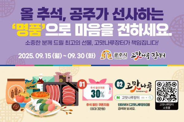 [충청중심뉴스] 공주시는 시가 직접 운영하는 농특산물 온라인 쇼핑몰 ‘고맛나루장터’에서 민족 최대 명절인 추석을 맞아 9월 15일부터 9월 30일까지 ‘추석맞이 기획전’을 진행한다고 밝혔다.