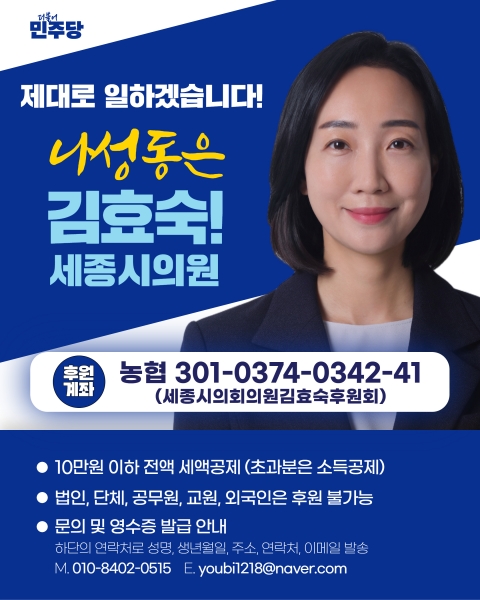 [충청중심뉴스] 세종시의회 부의장인 김효숙 의원이 시민의 정치 참여 확산을 위해 세종 지역 광역의원 최초로 후원회를 개설하고 적극적인 홍보에 나섰다.