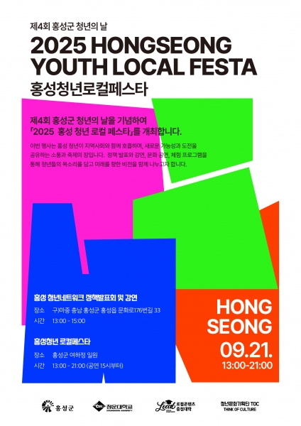 [충청중심뉴스] 홍성군은 법정기념일인 청년의 날을 맞아 오는 21일 오후 1시부터 오후 9시까지 군청 여하정 일원에서 ‘제4회 홍성 청년의 날 – 홍성청년 로컬페스타’를 개최한다고 밝혔다.