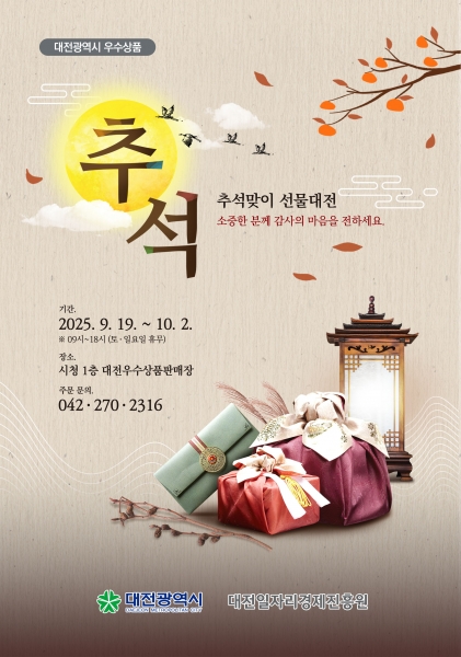 [충청중심뉴스] 대전시는 민족 최대의 명절 추석을 앞두고 지역 우수 상품을 널리 알리고 지역경제 활성화에 기여하기 위해 9월 19일부터 10월 2일까지 10일간 시청 1층 대전우수상품판매장에서 ‘추석맞이 선물대전’을 연다.