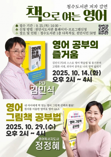 이번 강연은 10월 14일과 29일 오후 2시부터 4시까지 청수도서관 다목적실에서 운영되며 영어 원서를 활용한 공부법에 대해 안내할 예정이다.